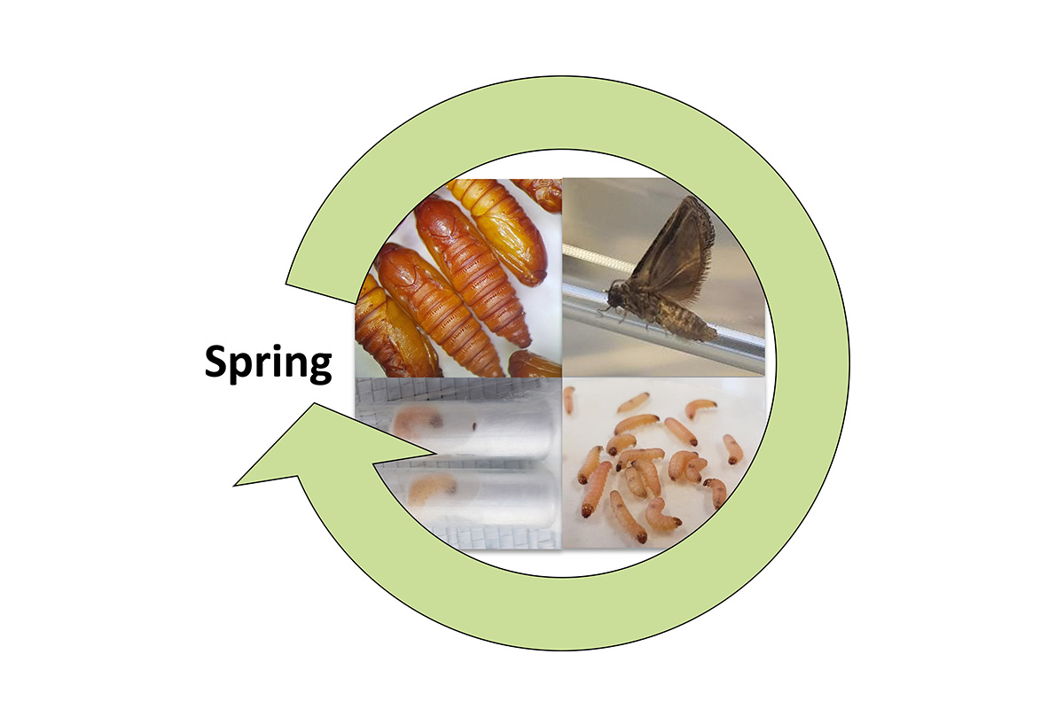 Um kalte Temperaturen und Nahrungsmangel zu überstehen, überwintern Insekten in Form eines Ruhestadium, der sogenannten Diapause. Der Apfelwickler spinnt sich hierzu im letzten Larvenstadium in einen Kokon ein, bevor er sich im Frühjahr verpuppt. In Abhängigkeit des Verpuppungszeitpunkts können sich dann in den Sommermonaten ein oder mehrere Schädlingsgenerationen entwickeln. Einem Forscherteam aus unserem Institut, dem Laimburg Versuchszentrum und des MPI für chemische Ökologie ist es nun gelungen, das verborgene Leben der Diapause des Apfelwickler ans Licht zu bringen. Der Apfelwickler unterscheidet sich von anderen Insekten, dass sich das Ende der Diapause über mehrere Wochen und Monate erstrecken kann. In einem über 15 Jahre währenden Selektionsexperimentes wurden an der Laimburg zwei AW-Stämme selektiert und genetisch fixiert, deren Verpuppungszeitpunkt sich um zwei Monate unterscheidet. Mit Hilfe umfangreicher Kreuzungsexperimente zwischen den beiden Stämmen konnte nun nachgewiesen werden, dass sich die genetischen Faktoren, die für diese Entwicklungssteuerung verantwortlich sind, auf mehreren Chromosomen des Apfelwickler befinden und damit zu einer höchst komplexen Diapausesteuerung beitragen. Die Untersuchungen ergaben zudem Hinweise, dass sich der Klimawandel auf den Verpuppungszeitpunkt auswirkt. Zwischen 2007 und 2022 hat sich die Verpuppung jährlich um durchschnittlich 0,6 Tage nach vorne verschoben und beginnt damit heute ca. zwei Wochen früher als noch vor 25 Jahren.
