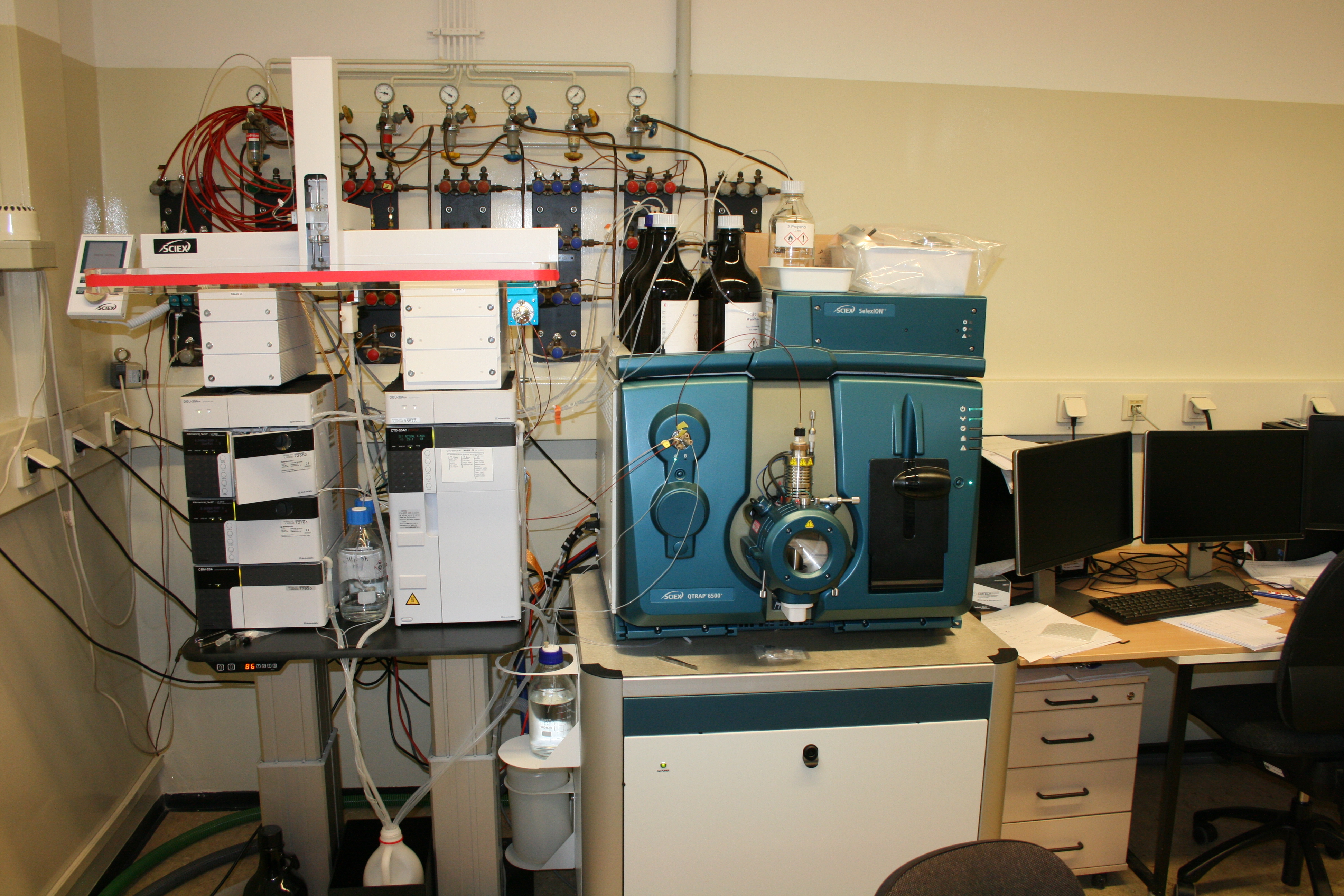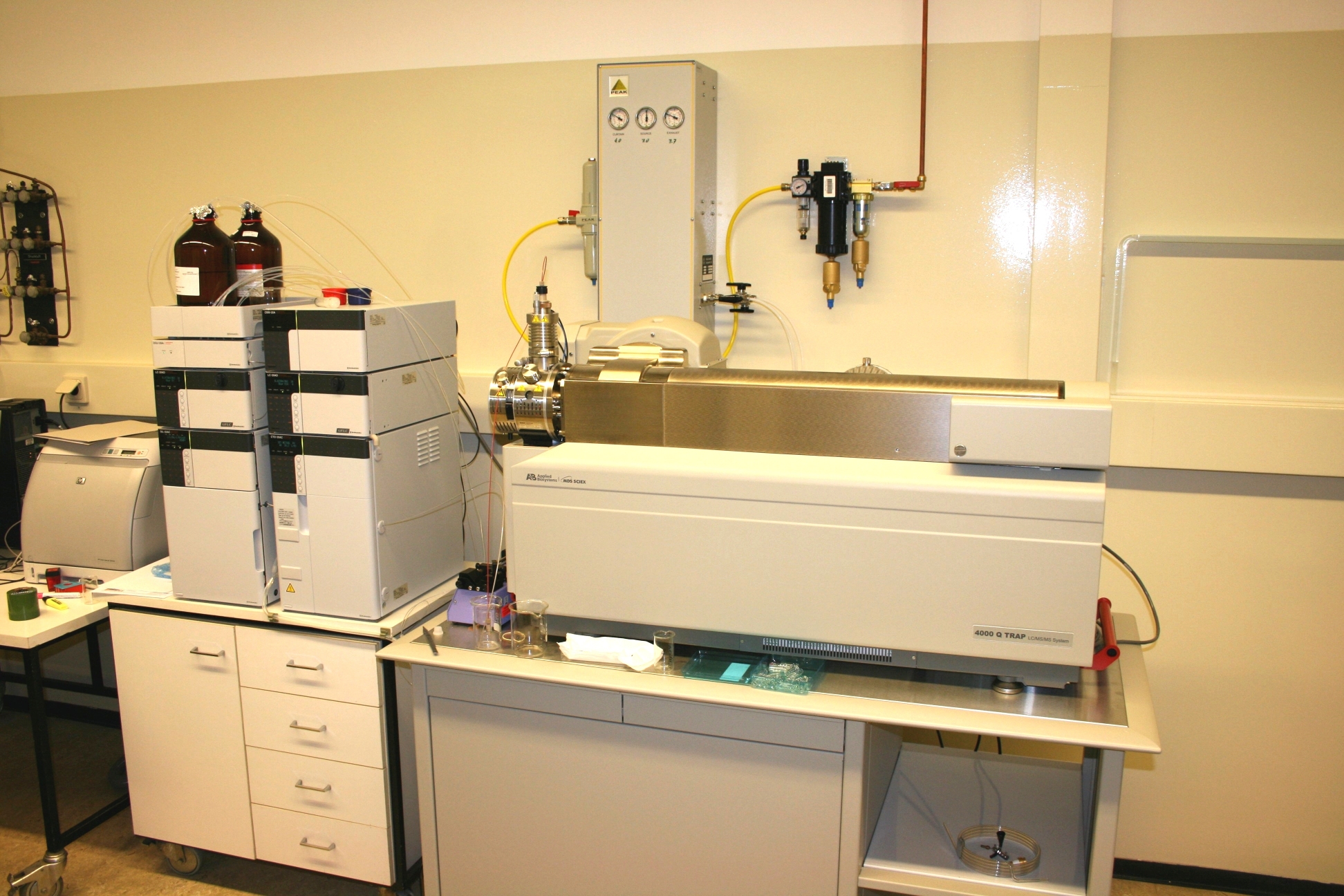 The LC-MS/MS measuring system consists of a SCIEX Triple Quadrupole 4000 QTRAP mass spectrometer with IonDrive Turbo V source, that can be used either for electrospray ionization (ESI) or for chemical ionization at atmospheric pressure (APCI). The mass spectrometer is coupled to a Prominence UFLC XR HPLC system with an autosampler.