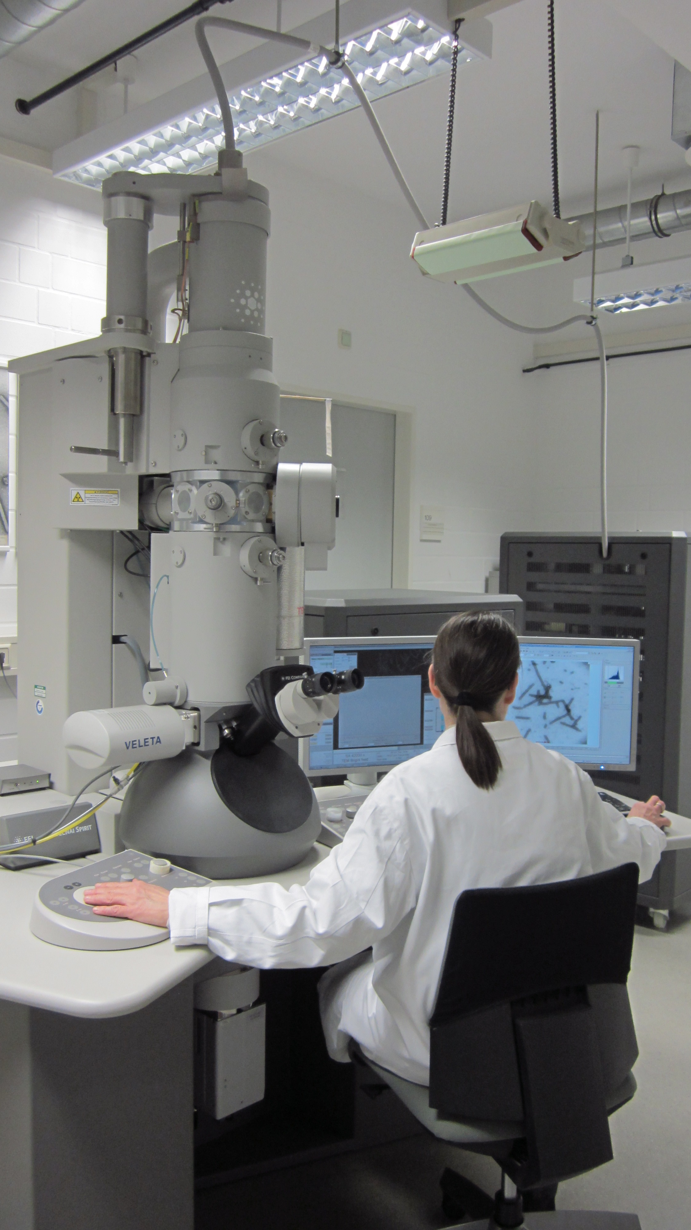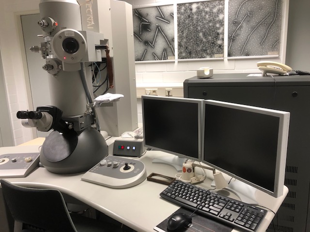 Description: Transmission electron microscope, 120 kV, tungsten cathode, with one analog and two digital cameras (2K Veleta on the side and 4K Eagle below) for documentation. Sample analysis at 80 kV for optimal contrast in biological objects. Version: Tecnai G2 Spirit (serial number D1285), FEI Deutschland GMBH.