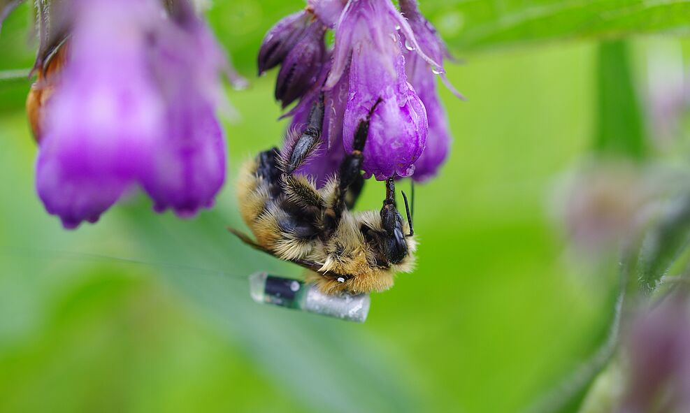 Anfang Juni dieses Jahres folgte ein zweiter Versuch, bei dem die Sender an den größeren Königinnen der Mooshummeln befestigt wurden. Leider flogen auch diese Königinnen entweder gar nicht erst ab oder gingen nach wenigen Metern wieder zu Boden. Das Verhalten der Tiere wurde genau beobachtet und die Sender anschließend wieder abgenommen.