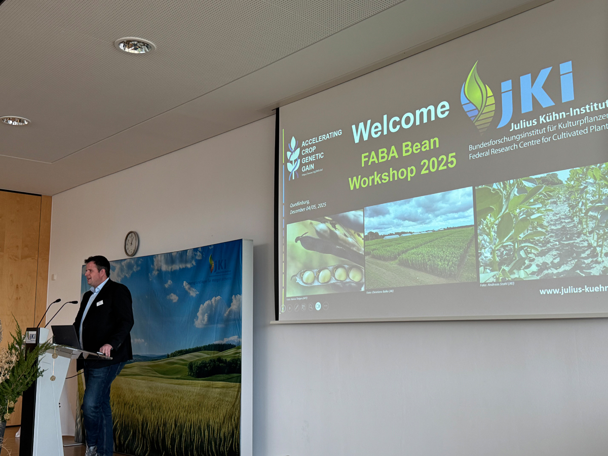 (Quedlinburg) Der Anbau von Ackerbohnen (Vicia faba L.) ist ein wichtiger Baustein für eine nachhaltige Landwirtschaft. Die Leguminose ist nicht nur eine heimische Proteinquelle, sondern trägt, wie alle Pflanzen der Familie, maßgeblich zur biologischen Stickstofffixierung bei. Sie reduziert also den Bedarf an energieintensivem mineralischem Stickstoffdünger und leistet einen wichtigen Beitrag zur Diversifizierung enger, getreidelastiger Fruchtfolgen. Trotz der genannten Vorzüge, spielte die Ackerbohne lange nur eine untergeordnete Rolle in der pflanzenzüchterischen Forschung. Das Julius Kühn-Institut rückt deshalb die Ackerbohne in den Fokus eigener Züchtungsforschung, etwa durch seine Beteiligung an dem von der Deutschen Forschungsgemeinschaft (DFG) geförderten Graduiertenkolleg „Accelerating Crop Genetic Gain“. Zudem treibt das Bundesforschungsinstitut die Vernetzung mit den Akteuren in Forschung und Praxis voran, etwa indem es im Dezember 2025 einen Workshop in Quedlinburg ausrichtete.