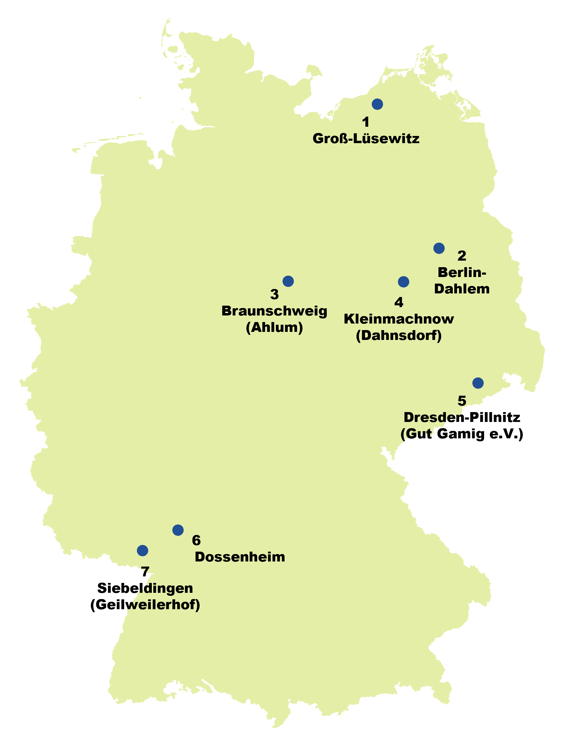 | 1 | A | Groß-Lüsewitz | 6,3 | 47 | 2000 | DE-ÖKO-039 | Züchtungsforschung an Kartoffel (Krautfäule), Hafer (Flugbrand), Buchweizen und Lupinen |